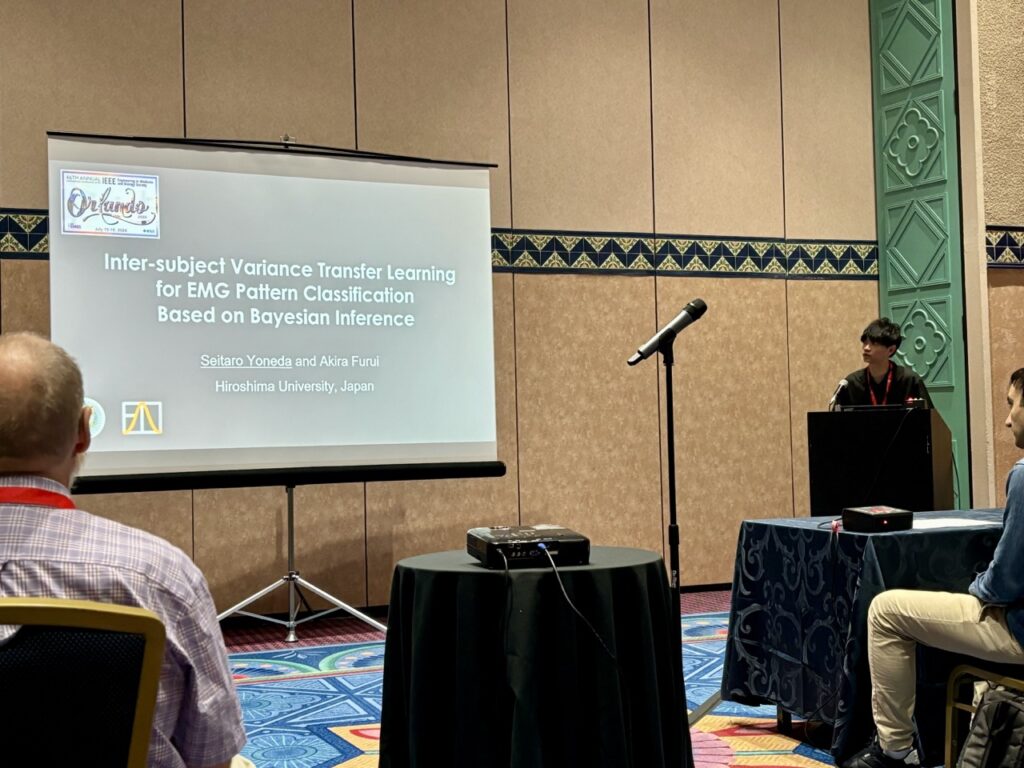 - Seitaro Yoneda and Akira Furui, “Inter-Subject Variance Transfer Learning for EMG Pattern Classification Based on Bayesian Inference”, Proceedings of the 46th Annual International Conference of the IEEE Engineering in Medicine & Biology Society (EMBC2024), Orlando, Florida, USA, Jul 15–20, 2024.
