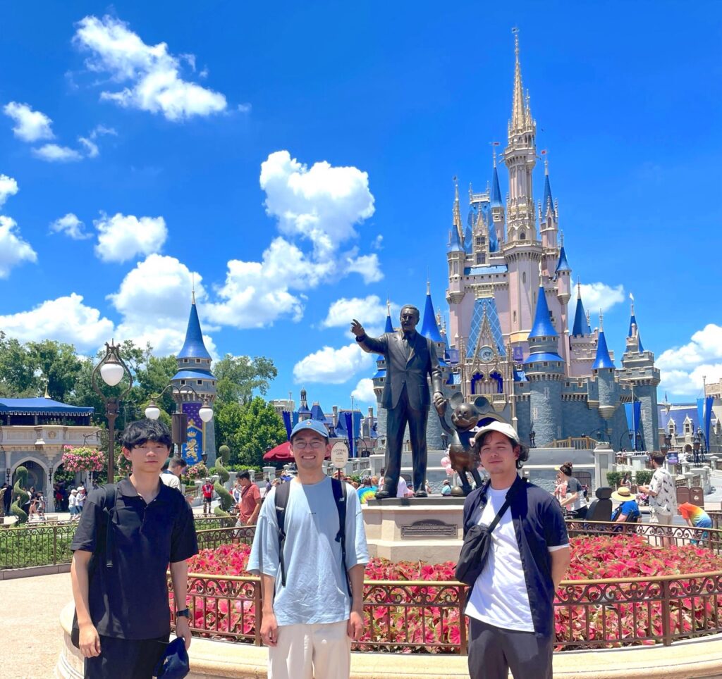 ディズニーワールドにて.左から米田君,吉冨君,古居(非常に眩しかった…)