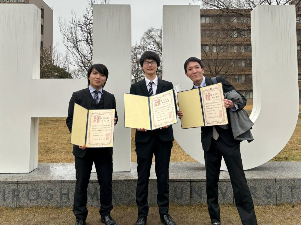 2024年3月23日に令和5年度(2023年度)広島大学学位記授与式(卒業式)が行われ,古居グループから学部生の松岡 真生君,廣池 友哉君,矢沢 樹君に学士(情報科学)の学位が授与されました.