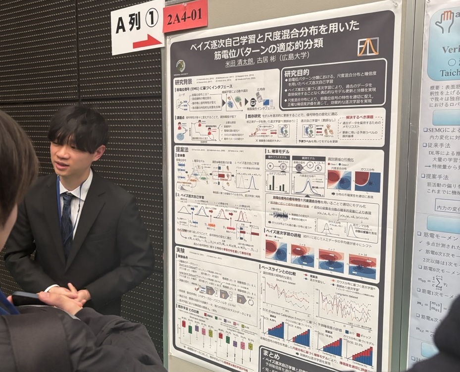 - 米田清太朗, 古居彬, “ベイズ逐次自己学習と尺度混合分布を用いた筋電位パターンの適応的分類,” 第25回計測自動制御学会システムインテグレーション部門講演会(SI2024), pp. 1613–1618, 2024年12月.