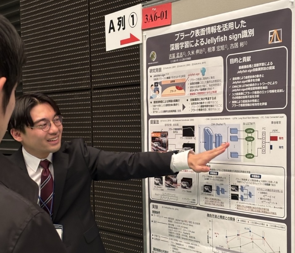 - 吉冨孟志, 久米伸治, 相澤宏旭, 古居彬,”プラーク表面情報を活用した深層学習によるJellyfish sign識別,” 第25回計測自動制御学会システムインテグレーション部門講演会(SI2024), pp. 2830–2835, 2024年12月.