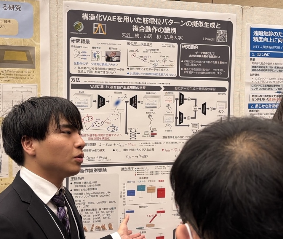 - 矢沢樹, 古居彬, “構造化VAEを用いた筋電位パターンの擬似生成と複合動作の識別,” 第26回計測自動制御学会システムインテグレーション部門講演会(SI2025), pp. 1459–1464, 2025年12月.
