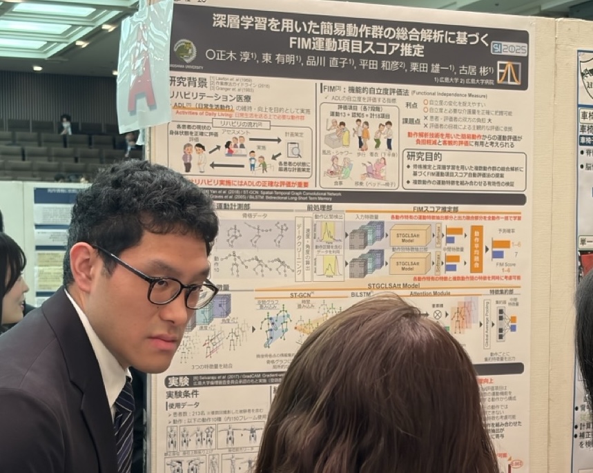 - 正木淳, 東有明, 品川直子, 平田和彦, 栗田雄一, 古居彬, “深層学習を用いた簡易動作群の総合解析に基づくFIM運動項目スコア推定,” 第26回計測自動制御学会システムインテグレーション部門講演会(SI2025), pp. 3300–3305, 2025年12月.