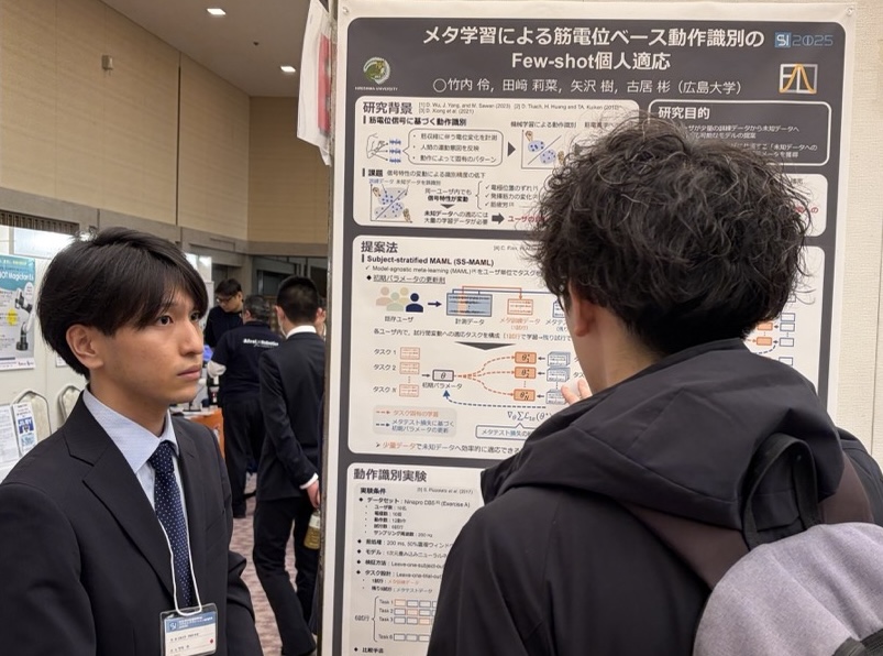 - 竹内伶, 田﨑莉菜, 矢沢樹, 古居彬, “メタ学習による筋電位ベース動作識別のFew-shot個人適応,” 第26回計測自動制御学会システムインテグレーション部門講演会(SI2025), pp. 4840–4844, 2025年12月.