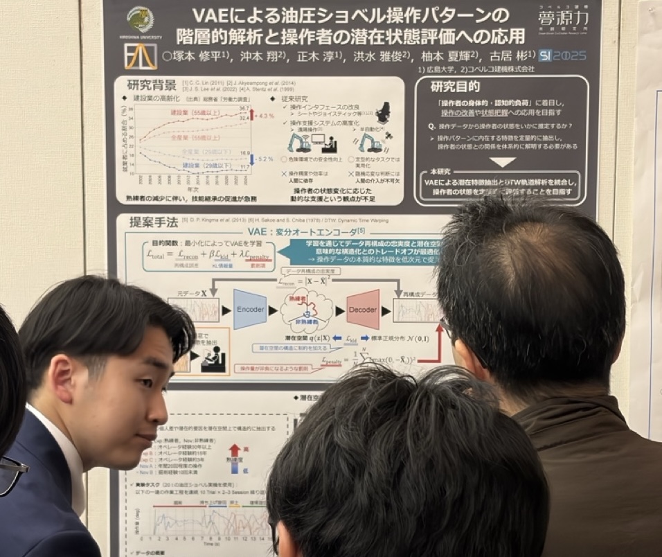 - 塚本修平, 沖本翔, 正木淳, 洪水雅俊, 柚本夏輝, 古居彬, “VAEによる油圧ショベル操作パターンの階層的解析と操作者の潜在状態評価への応用,” 第26回計測自動制御学会システムインテグレーション部門講演会(SI2025), pp. 4190–4195, 2025年12月.